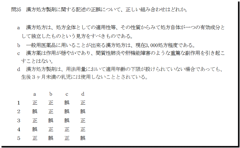 選択肢dの「漢方処方製剤は、用法用量において適用年齢の下限が設けられていない場合であっても、 生後3ヶ月未満の乳児には使用しないこととされている。」ですが、正しい記述です。