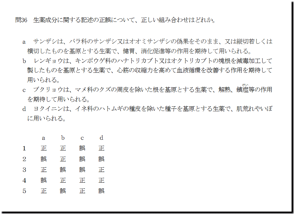 本問は、「医薬品」の「生薬成分」についての問題です。生薬で問題が構成されています。勉強した人でないと解けないですね。過去問に出たことは、甘く見てはいけないので、復習だけはしておきましょう。