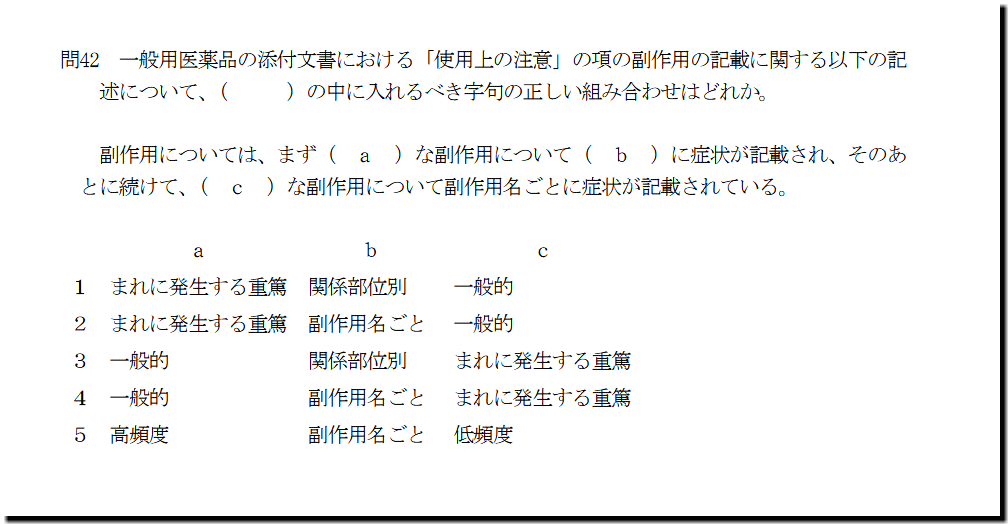 なお、本問の解答は、こちら(数字のみ)です。 副作用については、まず( a )な副作用について( b )に症状が記載され、そのあ とに続けて、( c )な副作用について副作用名ごとに症状が記載されている。 a b c 1 まれに発生する重篤 関係部位別 一般的 2 まれに発生する重篤 副作用名ごと 一般的 3 一般的 関係部位別 まれに発生する重篤 4 一般的 副作用名ごと まれに発生する重篤 5 高頻度 副作用名ごと 低頻度 3