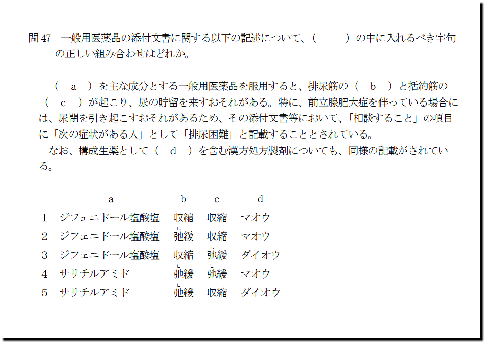 なお、本問の解答は、こちら(数字のみ)です。 ( a )を主な成分とする一般用医薬品を服用すると、排尿筋の( b )と括約筋の ( c )が起こり、尿の貯留を来すおそれがある。特に、前立腺肥大症を伴っている場合に は、尿閉を引き起こすおそれがあるため、その添付文書等において、「相談すること」の項目 に「次の症状がある人」として「排尿困難」と記載することとされている。 なお、構成生薬として( d )を含む漢方処方製剤についても、同様の記載がされてい る。 a b c d 1 ジフェニドール塩酸塩 収縮 収縮 マオウ 2 ジフェニドール塩酸塩 弛 し 緩 収縮 マオウ 3 ジフェニドール塩酸塩 収縮 弛 し 緩 ダイオウ 4 サリチルアミド 弛 し 緩 弛 し 緩 マオウ 5 サリチルアミド 弛 し 緩 収縮 ダイオウ 2