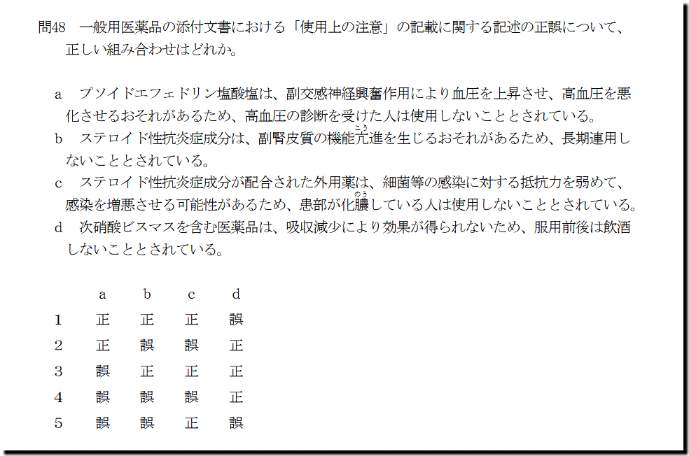 選択肢cの「ステロイド性抗炎症成分が配合された外用薬は、細菌等の感染に対する抵抗力を弱めて、 感染を増悪させる可能性があるため、患部が化膿 している人は使用しないこととされている。」ですが、正しい記述です。