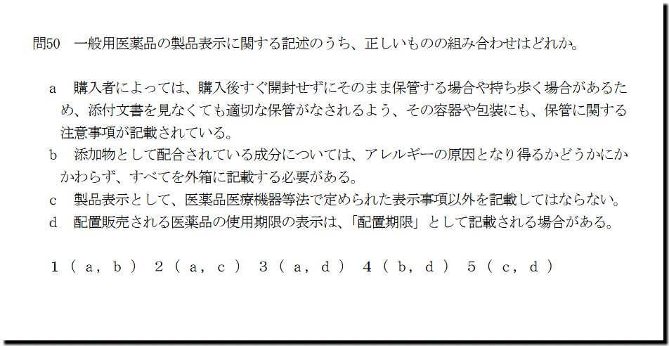 本問は、「適正使用」の「一般用医薬品の製品表示」についての問題です。「相談すること」は、費用対効果の悪い論点で、時間に余裕がないなら、「捨て問」です。また、本問は、漢方処方製剤の選択肢もあるので、「捨て問」でも、仕方がないです。