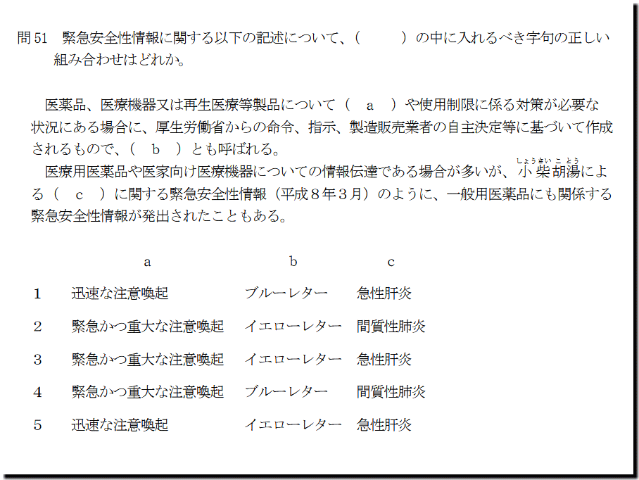 なお、本問の解答は、こちら(数字のみ)です。 医薬品、医療機器又は再生医療等製品について( a )や使用制限に係る対策が必要な 状況にある場合に、厚生労働省からの命令、指示、製造販売業者の自主決定等に基づいて作成 されるもので、( b )とも呼ばれる。 医療用医薬品や医家向け医療機器についての情報伝達である場合が多いが、 とう によ る( c )に関する緊急安全性情報(平成8年3月)のように、一般用医薬品にも関係する 緊急安全性情報が発出されたこともある。 a b c 1 迅速な注意喚起 ブルーレター 急性肝炎 2 緊急かつ重大な注意喚起 イエローレター 間質性肺炎 3 緊急かつ重大な注意喚起 イエローレター 急性肝炎 4 緊急かつ重大な注意喚起 ブルーレター 間質性肺炎 5 迅速な注意喚起 イエローレター 急性肝炎 2