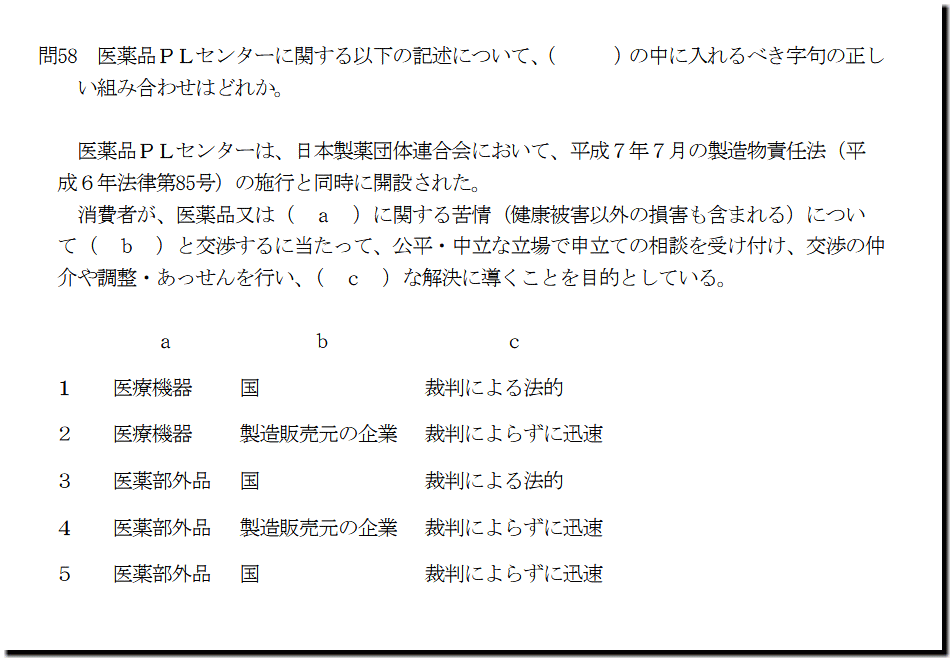 なお、本問の解答は、こちら(数字のみ)です。 医薬品PLセンターは、日本製薬団体連合会において、平成7年7月の製造物責任法(平 成6年法律第85号)の施行と同時に開設された。 消費者が、医薬品又は( a )に関する苦情(健康被害以外の損害も含まれる)につい て( b )と交渉するに当たって、公平・中立な立場で申立ての相談を受け付け、交渉の仲 介や調整・あっせんを行い、( c )な解決に導くことを目的としている。 a b c 1 医療機器 国 裁判による法的 2 医療機器 製造販売元の企業 裁判によらずに迅速 3 医薬部外品 国 裁判による法的 4 医薬部外品 製造販売元の企業 裁判によらずに迅速 5 医薬部外品 国 裁判によらずに迅速 4