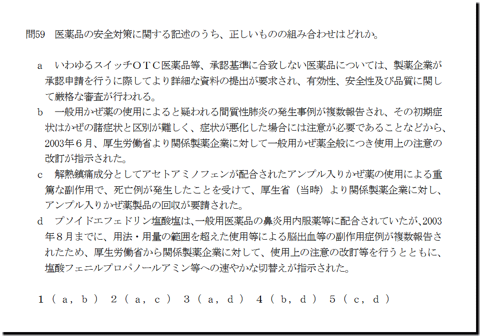 選択肢dの「プソイドエフェドリン塩酸塩は、一般用医薬品の鼻炎用内服薬等に配合されていたが、2003 年8月までに、用法・用量の範囲を超えた使用等による脳出血等の副作用症例が複数報告さ れたため、厚生労働省から関係製薬企業に対して、使用上の注意の改訂等を行うとともに、 塩酸フェニルプロパノールアミン等への速やかな切替えが指示された。」ですが、誤った記述です。