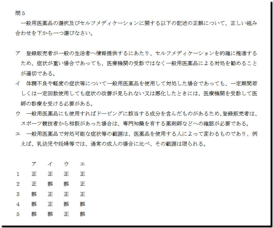 登録販売者 福岡県 令和7年度(2025年度)試験の第5問は、「基本知識」の「セルフメディケーション」の問題です。テキストを精読し、過去問演習を繰り返していれば、まず、解ける問題です。貴重な1点を確保です。