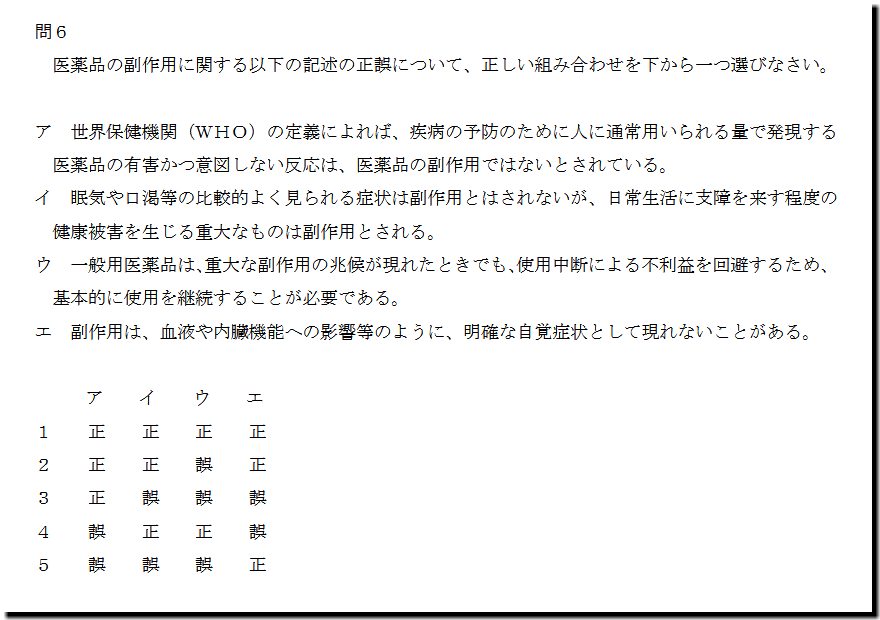選択肢アの「世界保健機関(WHO)の定義によれば、疾病の予防のために人に通常用いられる量で発現する 医薬品の有害かつ意図しない反応は、医薬品の副作用ではないとされている。」ですが、誤った記述です。