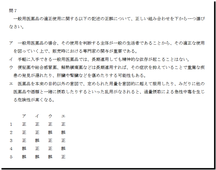 選択肢イの「手軽に入手できる一般用医薬品では、長期連用しても精神的な依存が起こることはない。」ですが、誤った記述です。