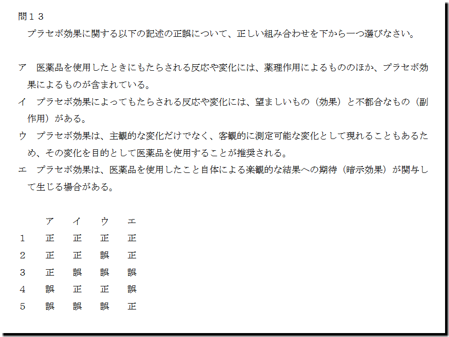 本問は、「基本知識」の「プラセボ効果」についての出題です。基礎・基本的なものばかりなので、難しいところはありません。テキストと過去問を繰り返しておけば、まず、取れます。