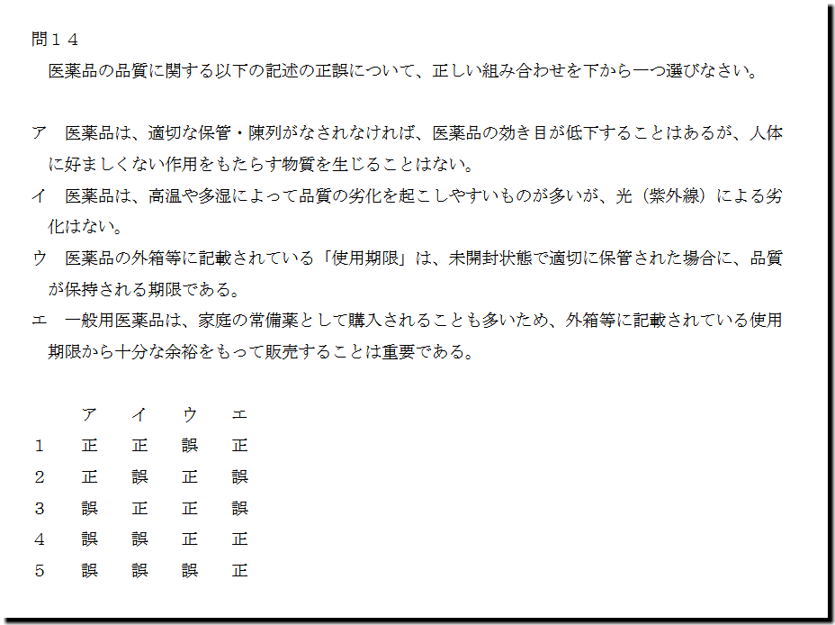 本問は、「基本知識」の「医薬品の品質」についての出題です。基礎・基本的なものばかりなので、難しいところはありません。テキストと過去問を繰り返しておけば、まず、取れます。