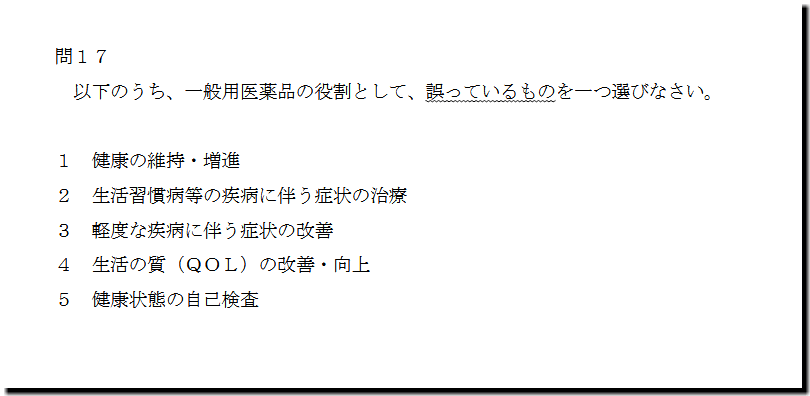 本問は、「基本知識」の「一般用医薬品の役割」についての出題です。毎年出る論点であり、登録販売者として知っておくべき事項です。必ず押えておきましょう。
