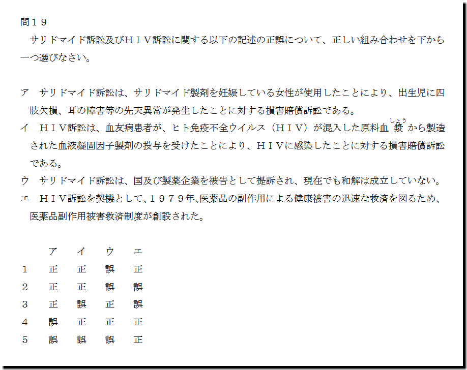 本問は、「基本知識」の「サリドマイド訴訟及びHIV訴訟」についての出題です。基本知識では、ほぼ毎回出題される内容なので、テキストの精読は必須です。選択肢を1つとして、落とさないようにしましょう。