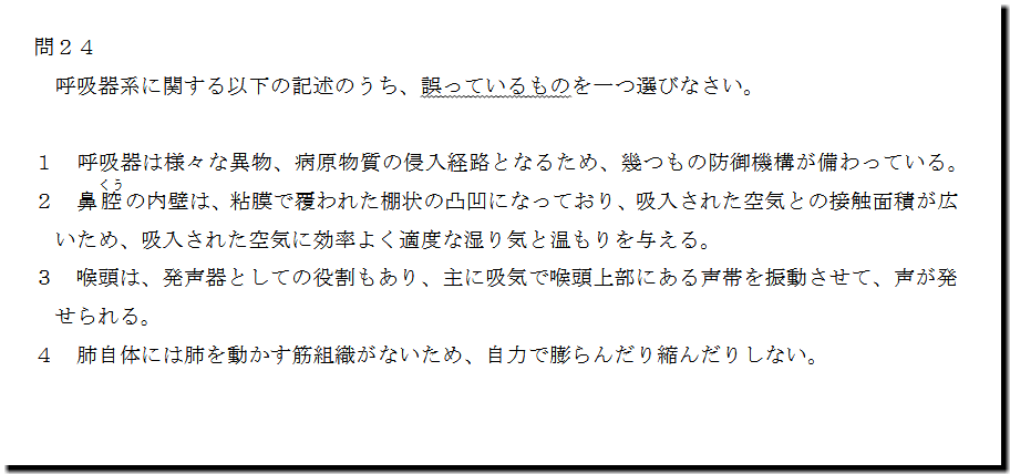 選択肢2の「鼻 腔 の内壁は、粘膜で覆われた棚状の凸凹になっており、吸入された空気との接触面積が広 いため、吸入された空気に効率よく適度な湿り気と温もりを与える。」ですが、正しい記述です。