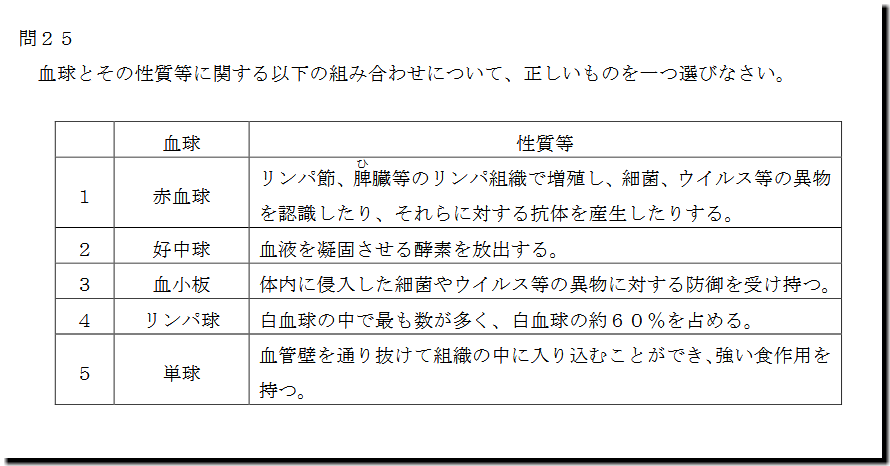 本問は、「人体」の「血球」についての出題です。基礎・基本的なものばかりなので、難しいところはありません。テキストと過去問を繰り返しておけば、まず、取れます。
