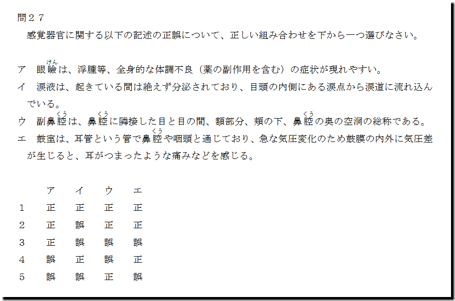 本問は、「人体」の「感覚器官」についての出題です。基礎・基本的なものばかりなので、難しいところはありません。テキストと過去問を繰り返しておけば、まず、取れます。