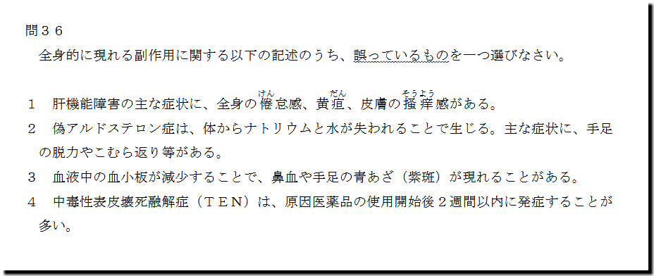 本問は、「人体」の「全身的に現れる副作用」の問題です。基礎・基本的なものばかりなので、難しいところはありません。テキストと過去問を繰り返しておけば、まず、取れます。