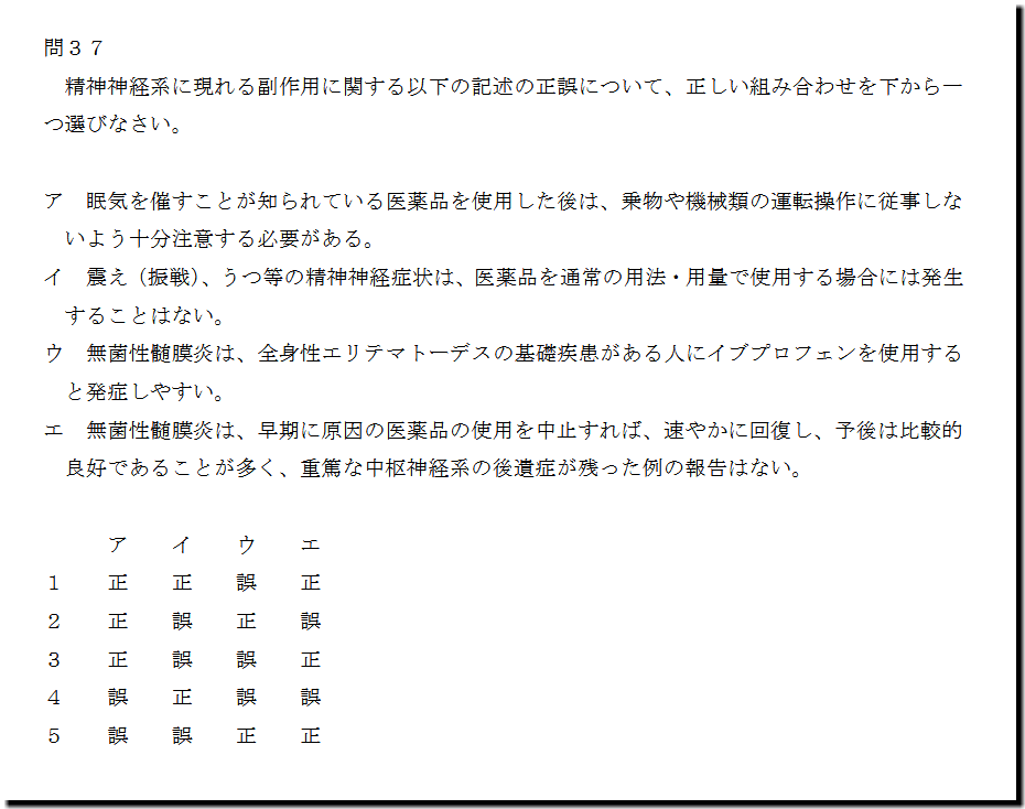 本問は、「人体」の「精神神経系に現れる副作用」についての問題です。基礎・基本的なものばかりなので、難しいところはありません。テキストと過去問を繰り返しておけば、まず、取れます。