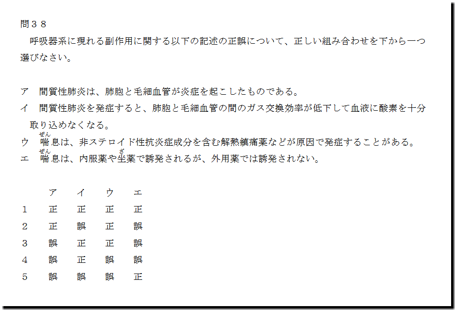 本問は、「人体」の「呼吸器系に現れる副作用」についての問題です。基礎・基本事項ばかりです。難しいところはありません。