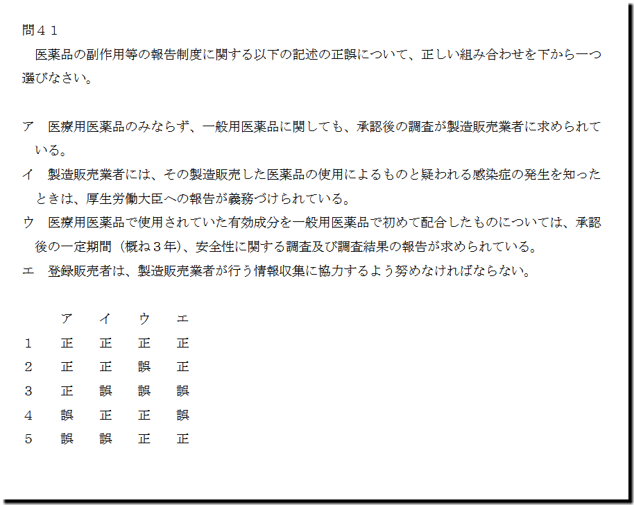 本問は、「適正使用」の「副作用等の報告制度」についての問題です。ガチの知識問題なので、知らないと解けません。ここは実によく出るので、何回もテキストを読んで、キーワードを押えておきましょう。