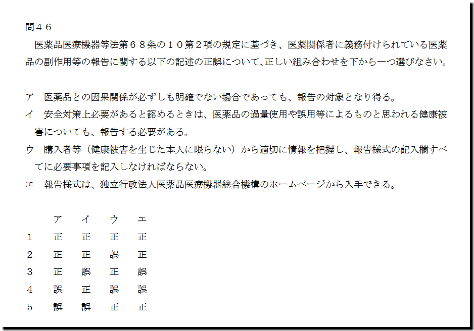 本問は、「適正使用」の「医薬関係者の副作用等の報告」についての問題です。基礎・基本的なものばかりなので、難しいところはありません。テキストと過去問を繰り返しておけば、まず、取れます。