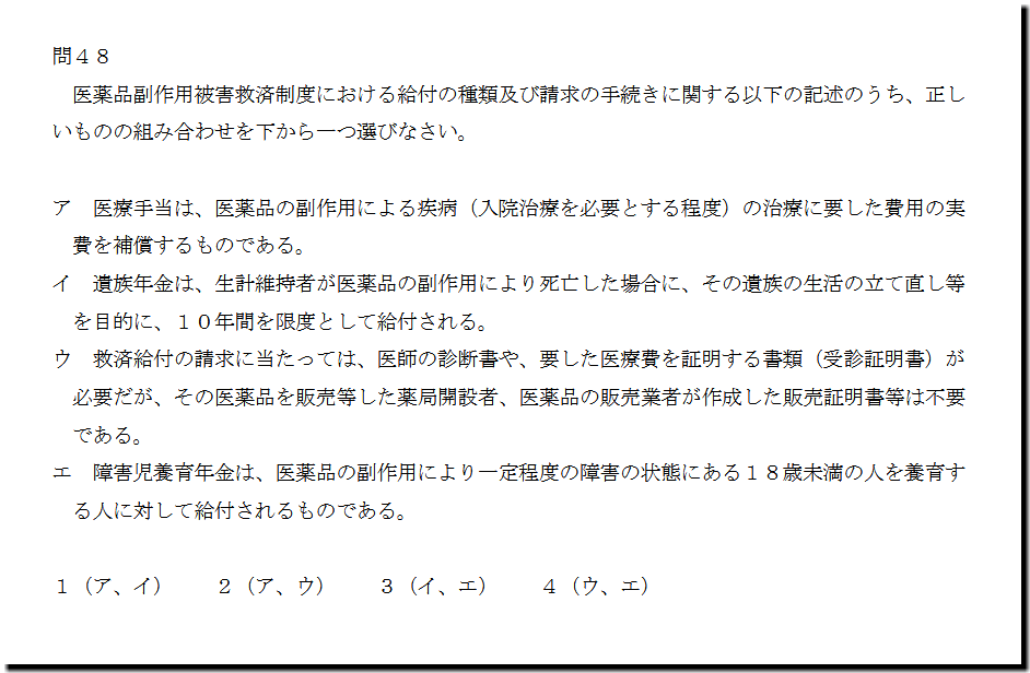 本問は、「適正使用」の「救済制度の給付」についての問題です。基礎・基本的なものばかりなので、難しいところはありません。テキストと過去問を繰り返しておけば、まず、取れます。