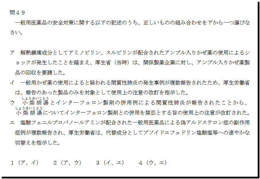 選択肢エの「塩酸フェニルプロパノールアミンが配合された一般用医薬品による偽アルドステロン症の副作用 症例が複数報告され、厚生労働省は、代替成分としてプソイドエフェドリン塩酸塩等への速やかな 切替えを指示した。」ですが、誤った記述です。