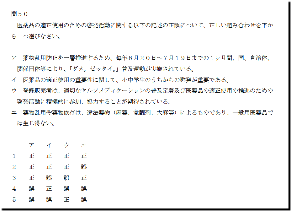 本問は、「適正使用」の「啓発活動」についての問題です。基礎・基本的なものばかりなので、難しいところはありません。テキストと過去問を繰り返しておけば、まず、取れます。