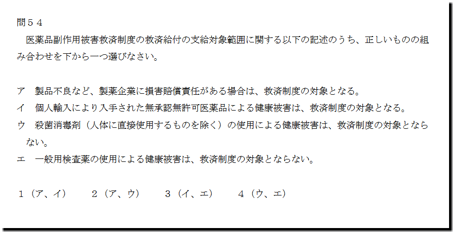 本問は、「適正使用」の「救済給付の支給対象範囲」についての問題です。基礎・基本的なものばかりなので、難しいところはありません。テキストと過去問を繰り返しておけば、まず、取れます。