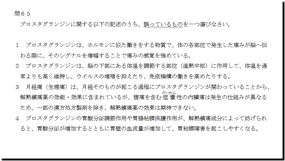 本問は、「医薬品」の「プロスタグランジン」についての問題です。漢方処方製剤の選択肢が1つ、生薬の選択肢が1つあります。残りの選択肢は、基本レベルです。本問は、先の漢方処方製剤と生薬の選択肢うち、どちらかが正確に判別できないと、最終解答が合わない問題です。できる選択肢を解いたら、後は、運を天に任せましょう。