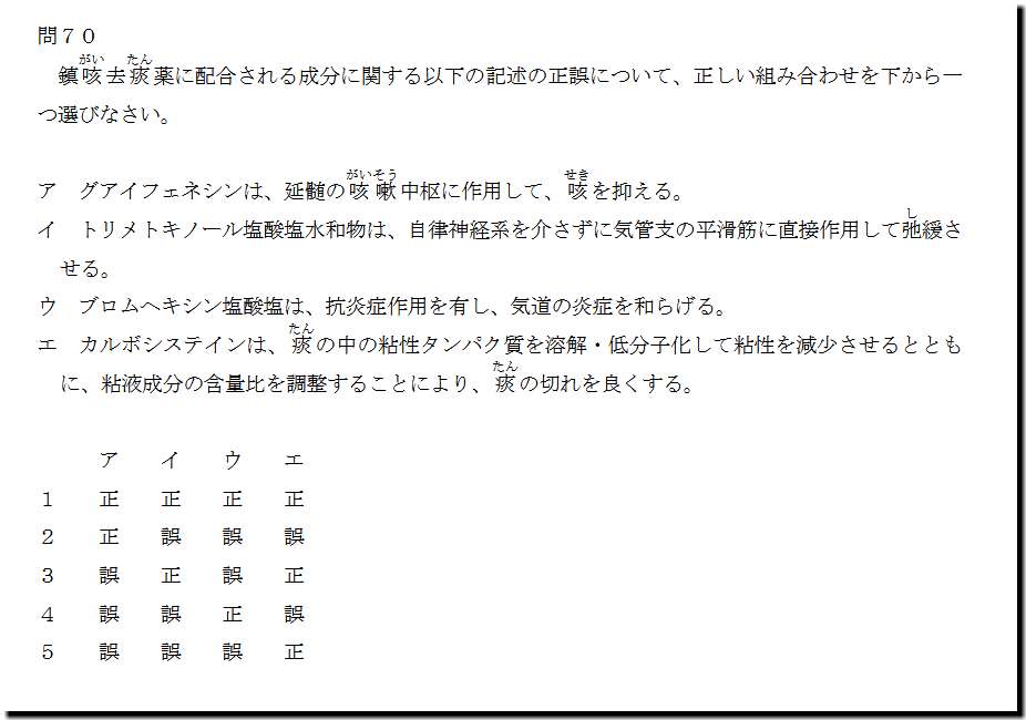 選択肢アの「グアイフェネシンは、延髄の 咳 嗽 中枢に作用して、 咳 を抑える。」ですが、誤った記述です。