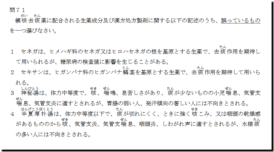 本問は、「医薬品」の「鎮咳去痰薬(漢方・生薬)」についての問題です。生薬と漢方処方製剤で選択肢が構成されています。漢方処方製剤を勉強してたら即答ですが、厳しいです。捨て問ですね。余裕のある人は、解けるようにはなっておきましょう。