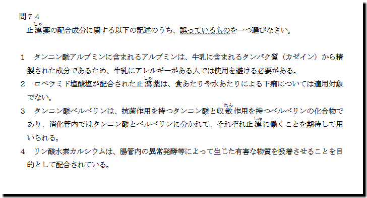 本問は、「医薬品」の「止瀉薬」についての問題です。 生薬の選択肢が1つありますが、最終解答には影響しないので、大丈夫なはずです。他の選択肢は、基礎レベルなので、テキストと過去問を繰り返しておけば、まず、取れます。