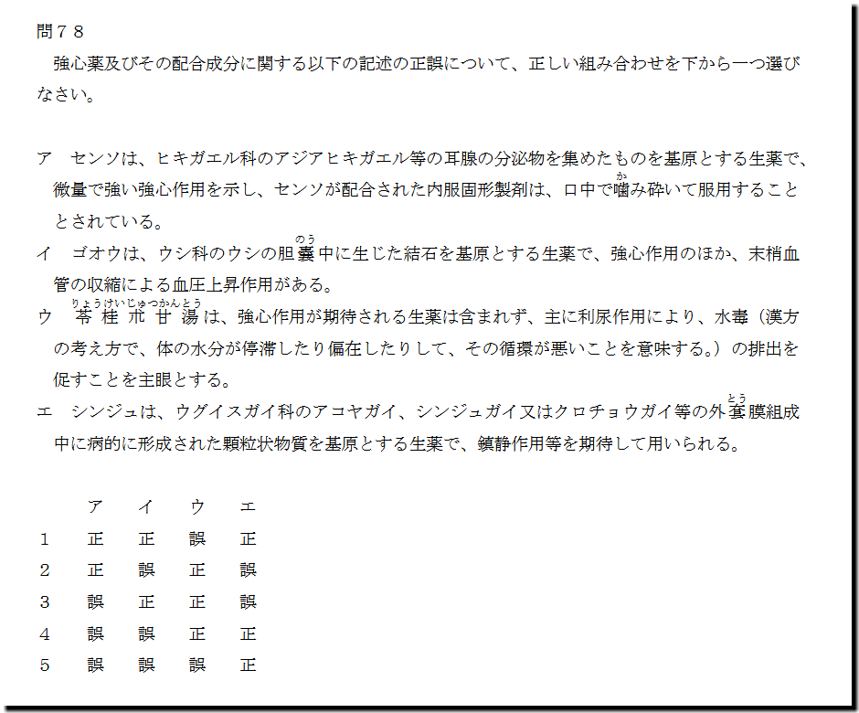 本問は、「医薬品」の「強心薬」についての問題です。生薬と漢方処方製剤の選択肢で構成されています。よく出るようになった混合問題です。勉強してないと解けないです。できるだけ、解けるようにはなっておきましょう。