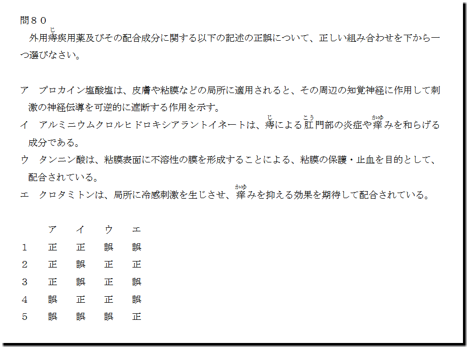 本問は、「医薬品」の「外用痔疾用薬」の問題です。基礎・基本的なものばかりなので、難しいところはありません。テキストと過去問を繰り返しておけば、まず、取れます。