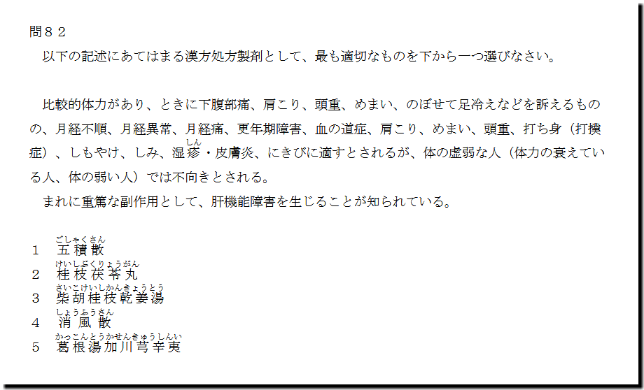 よって、「2」の「桂枝茯苓丸 」が答えとなります。 比較的体力があり、ときに下腹部痛、肩こり、頭重、めまい、のぼせて足冷えなどを訴えるもの の、月経不順、月経異常、月経痛、更年期障害、血の道症、肩こり、めまい、頭重、打ち身(打撲 症)、しもやけ、しみ、湿 疹 しん ・皮膚炎、にきびに適すとされるが、体の虚弱な人(体力の衰えてい る人、体の弱い人)では不向きとされる。 まれに重篤な副作用として、肝機能障害を生じることが知られている。 1 五 積 散 ごしゃくさん 2 桂 枝 茯 苓 丸 けいしぶくりょうがん 3 柴 胡 桂 枝 乾 姜 湯 さいこけいしかんきょうとう 4 消 風 散 しょうふうさん 5 葛 根 湯 加 川 芎 辛 夷 かっこんとうかせんきゅうしんい 2