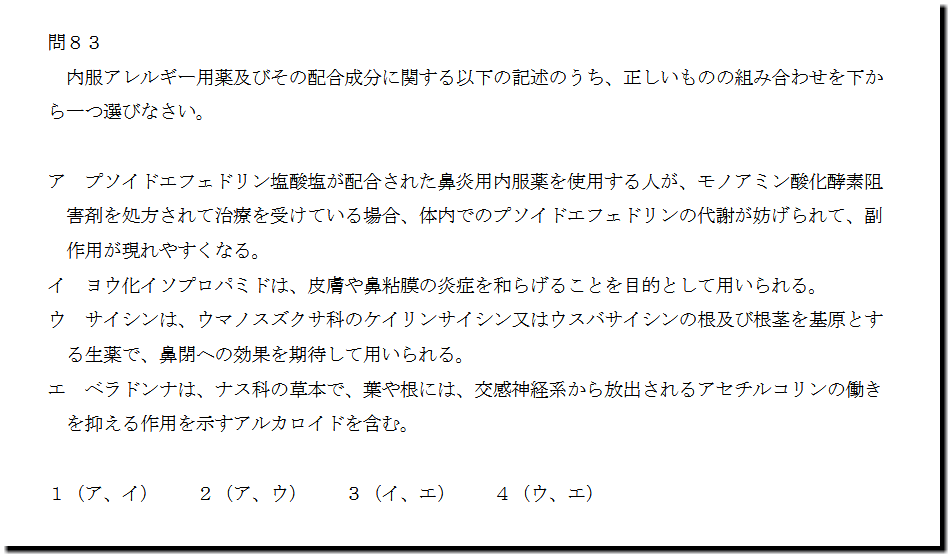 選択肢アの「プソイドエフェドリン塩酸塩が配合された鼻炎用内服薬を使用する人が、モノアミン酸化酵素阻 害剤を処方されて治療を受けている場合、体内でのプソイドエフェドリンの代謝が妨げられて、副 作用が現れやすくなる。」ですが、正しい記述です。