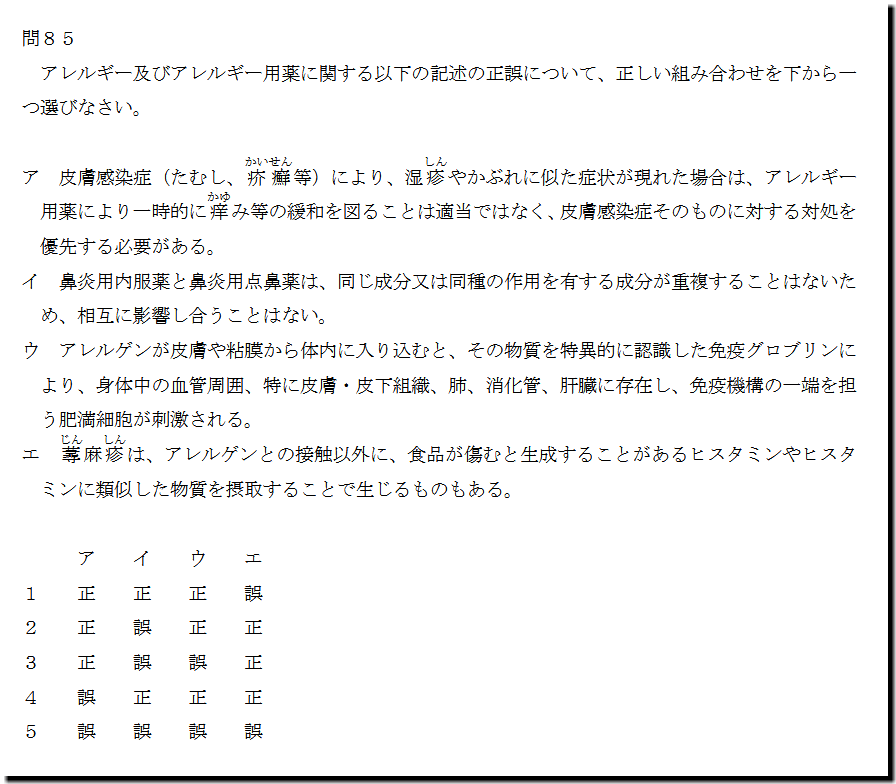 選択肢アの「皮膚感染症(たむし、 疥癬 等)により、湿 疹 やかぶれに似た症状が現れた場合は、アレルギー 用薬により一時的に 痒 み等の緩和を図ることは適当ではなく、皮膚感染症そのものに対する対処を 優先する必要がある。」ですが、正しい記述です。