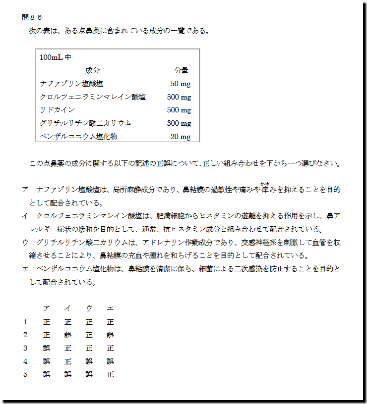 なお、本問の解答は、こちら(数字のみ)です。 ナファゾリン塩酸塩 50 mg クロルフェニラミンマレイン酸塩 500 mg リドカイン 500 mg グリチルリチン酸二カリウム 300 mg ベンザルコニウム塩化物