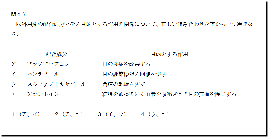 本問は、「医薬品」の「眼科用薬」についての問題です。難しいところはありません。基礎・基本事項の出題です。
