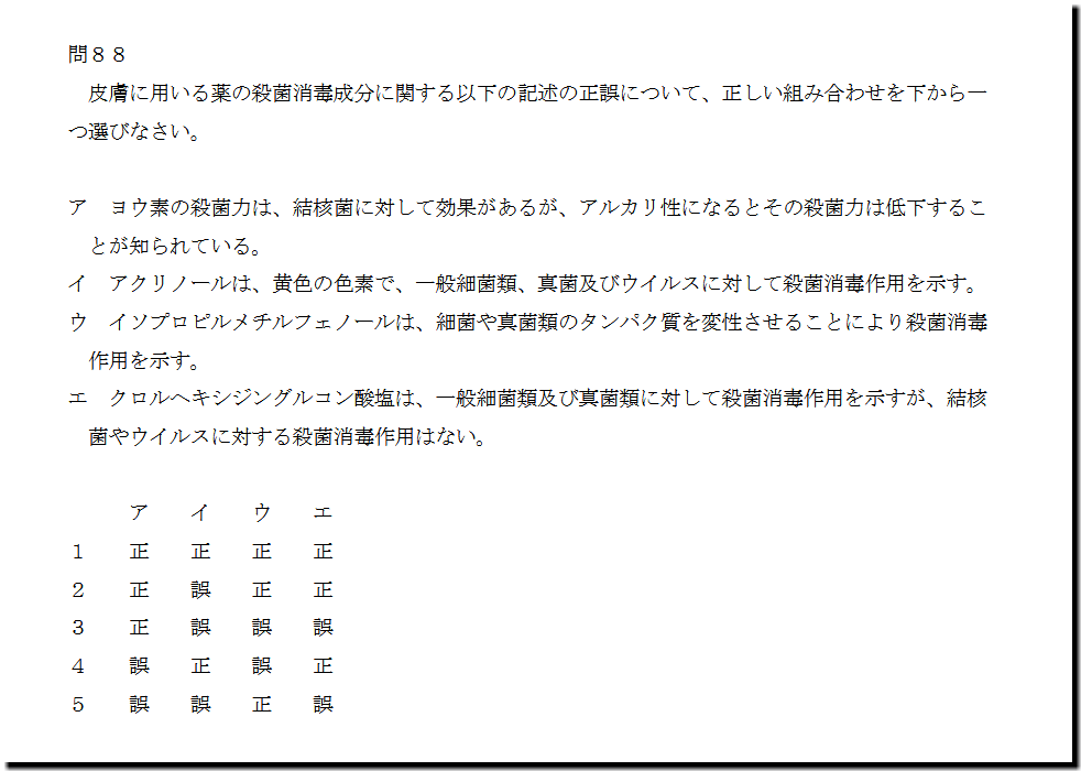 本問は、「医薬品」の「殺菌消毒成分」についての問題です。難しいところはありません。基礎・基本事項の出題です。