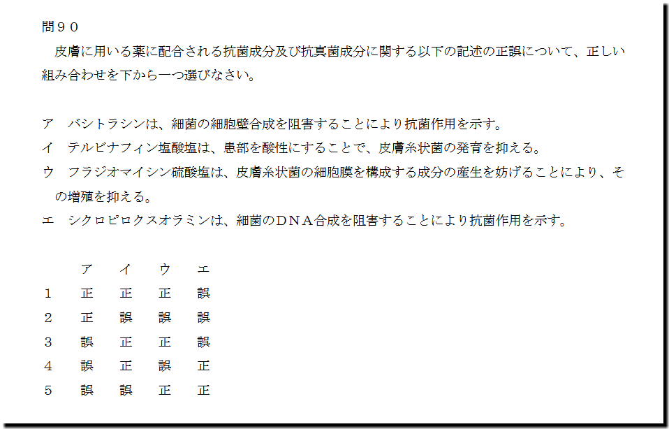 選択肢ウの「フラジオマイシン硫酸塩は、皮膚糸状菌の細胞膜を構成する成分の産生を妨げることにより、そ の増殖を抑える。」ですが、誤った記述です。