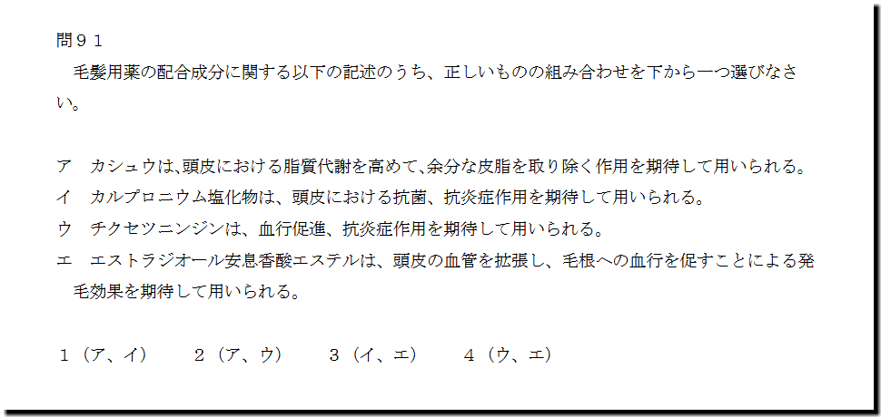 本問は、「医薬品」の「毛髪用薬」についての問題です。 生薬の選択肢が2つあります。生薬の選択肢ができないと正解できない問題です。んなもんで、生薬の勉強をしていないと、「お手上げ」なのですが、当該毛髪用薬の生薬は3~4個くらいしかないので、ここだけは、憶えておきたいところです。シッカリ復習しましょう。