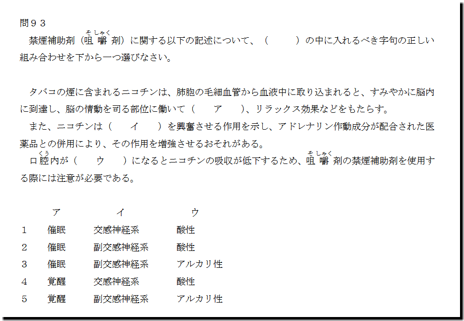 なお、本問の解答は、こちら(数字のみ)です。 タバコの煙に含まれるニコチンは、肺胞の毛細血管から血液中に取り込まれると、すみやかに脳内 に到達し、脳の情動を司る部位に働いて( ア )、リラックス効果などをもたらす。 また、ニコチンは( イ )を興奮させる作用を示し、アドレナリン作動成分が配合された医 薬品との併用により、その作用を増強させるおそれがある。 口 腔 くう 内が( ウ )になるとニコチンの吸収が低下するため、咀 そ 嚼 しゃく 剤の禁煙補助剤を使用す る際には注意が必要である。 ア イ ウ 1 催眠 交感神経系 酸性 2 催眠 副交感神経系 酸性 3 催眠 副交感神経系 アルカリ性 4 覚醒 交感神経系 酸性 5 覚醒 副交感神経系 アルカリ性 4 禁煙補助剤