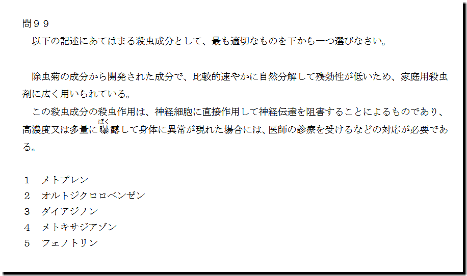 本問は、「医薬品」の「殺虫成分」についての問題です。難しいところはありません。テキストや過去問で、基礎・基本事項を押えて臨んでください。
