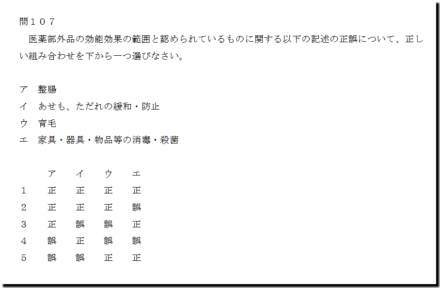 本問は、「法規」の「医薬部外品の効能効果」についての問題です。難しいところはありません。テキストや過去問で、基礎・基本事項を押えて臨んでください。