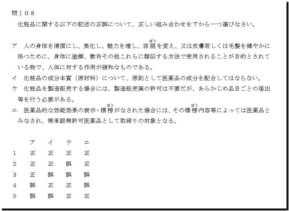 本問は、「法規」の「化粧品」についての問題です。基礎・基本的なものばかりなので、難しいところはありません。「医薬品」で勉強したことを思い出しながら、解答してください。
