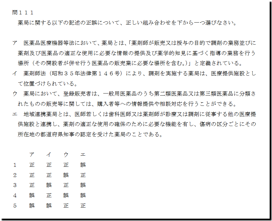 本問は、「法規」の「薬局」の問題です。ウンコみたいな出題者が作ったウンコみたいな選択肢が2つあります。こういう問題も出るので、傾向把握の一環として見ておきましょう。