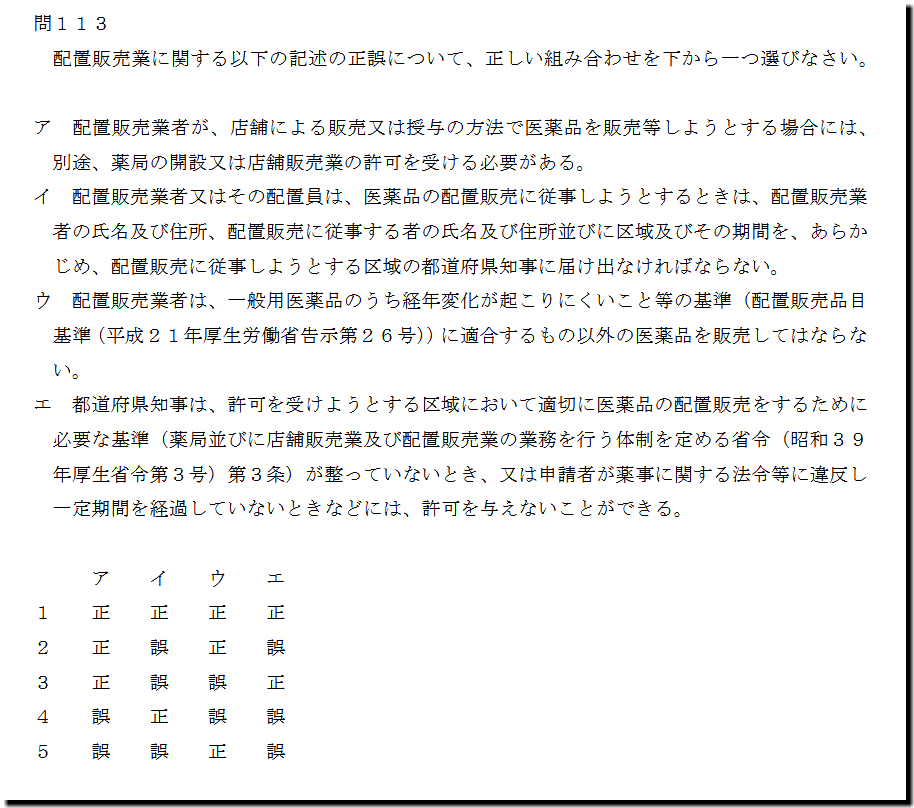 選択肢ウの「配置販売業者は、一般用医薬品のうち経年変化が起こりにくいこと等の基準(配置販売品目 基準(平成21年厚生労働省告示第26号))に適合するもの以外の医薬品を販売してはならな い。」ですが、正しい記述です。