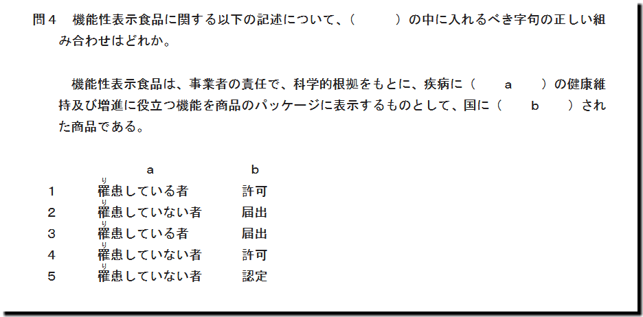 令和7年度(2025年度)福島県 登録販売者試験の過去問と解説。本問は、「基本知識」の「機能性表示食品」の問題です。基礎・基本的なものばかりなので、難しいところはありません。テキストと過去問を繰り返しておけば、まず、取れます。