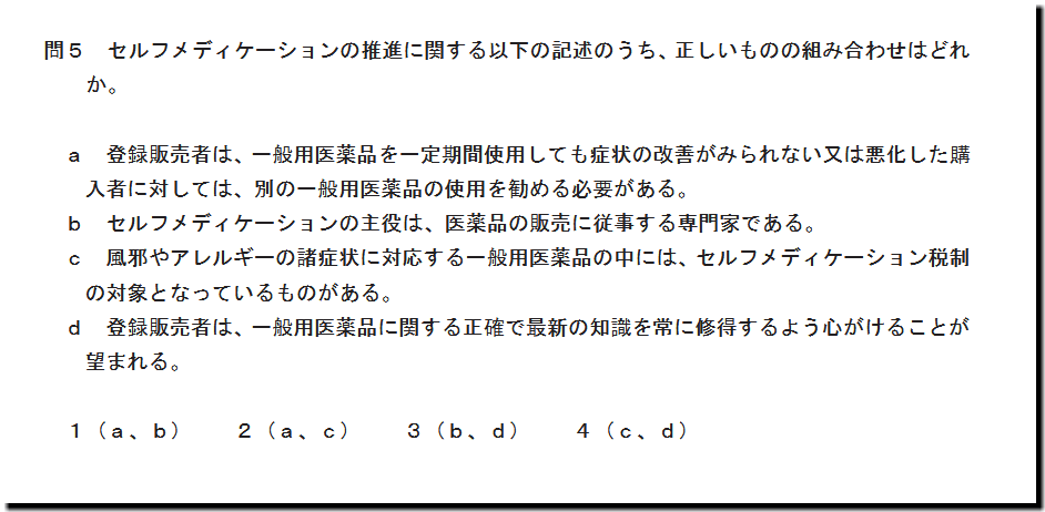 令和7年度(2025年度)福島県 登録販売者試験の過去問と解説。本問は、「基本知識」の「セルフメディケーション」の問題です。テキストを精読し、過去問演習を繰り返していれば、まず、解ける問題です。貴重な1点を確保です。